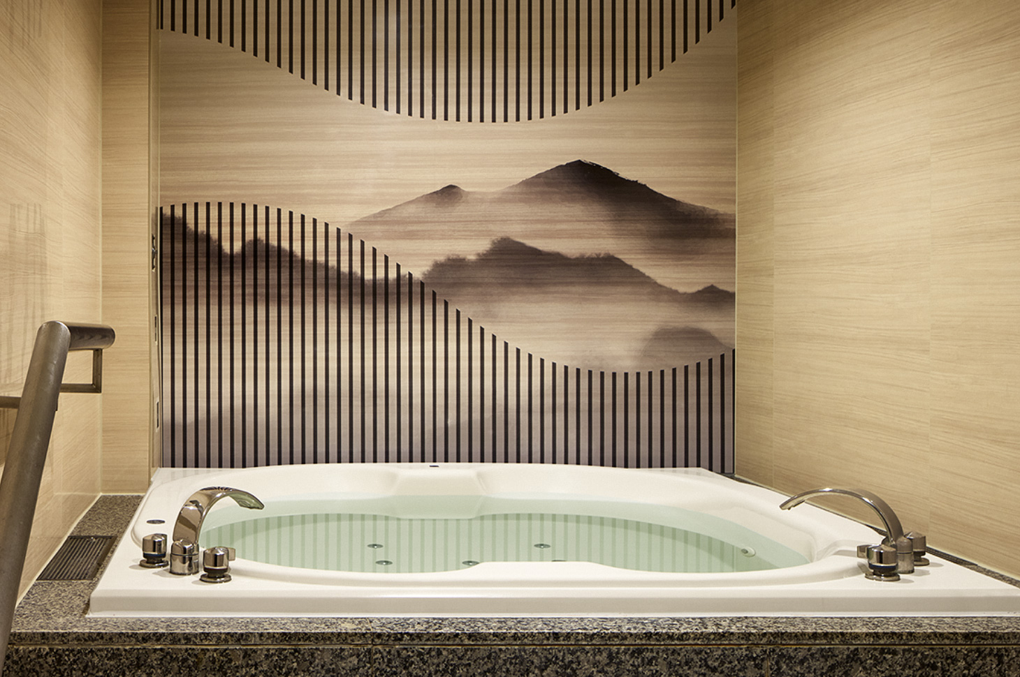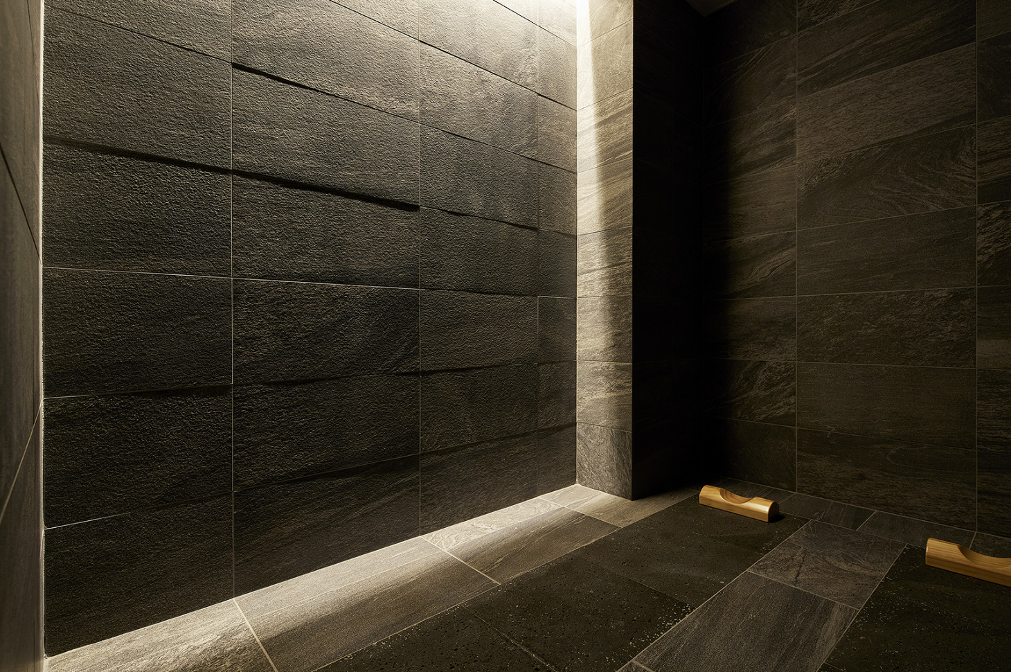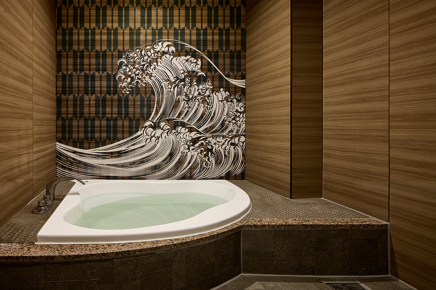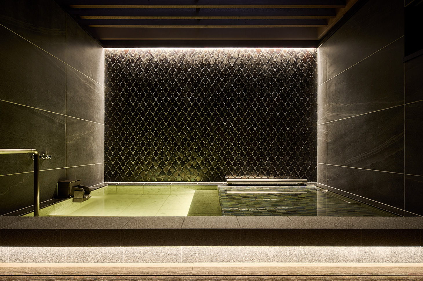 鱗のようなタイルを正面に取り込み、モノトーンでも動きのあるデザインに。大きい浴槽や2人で利用できる寝湯もあるので、複数人でもゆったり過ごすことができます。