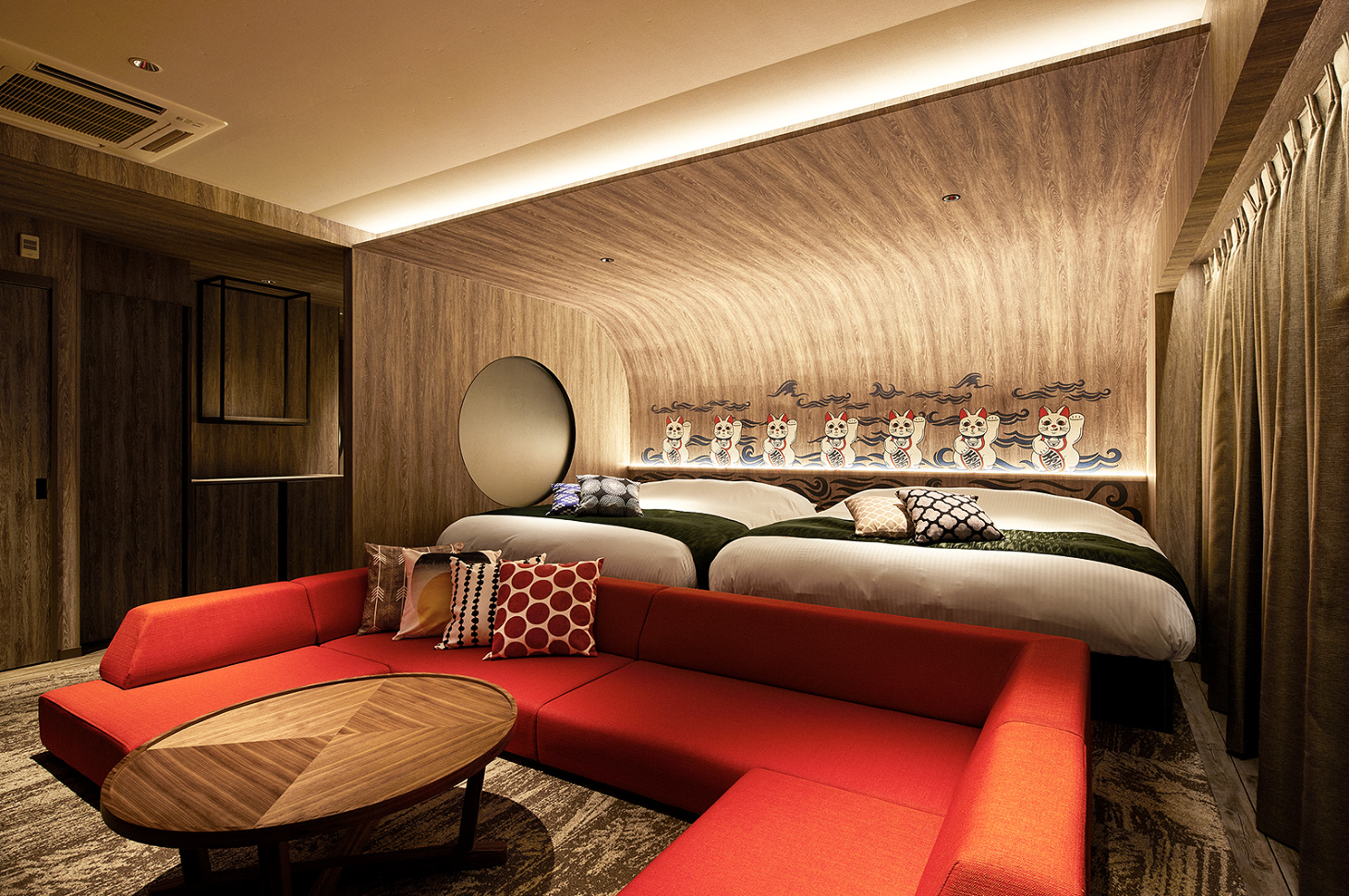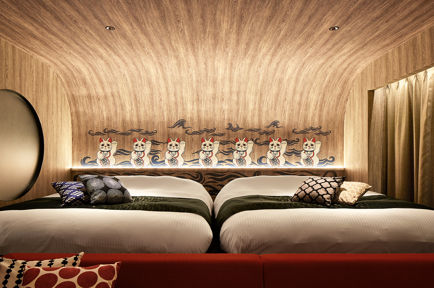 R天井で空間を優しくまとめ、招き猫によるユニークなグラフィックを施したお部屋です。